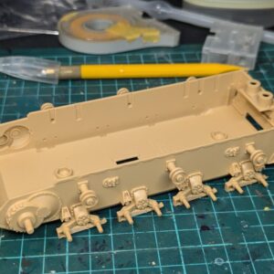 この車体下部・正面上部装甲板を中心に、牽引用アイプレートやフェンダーのマッドガード、ブレーキ点検ハッチ、トラベリングクランプ、クラッペ(視察窓)などを取り付けていきます。