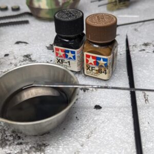 この塗料の良いところは履帯だけでなくOVMなどの鉄の部分にも使えるので、あらかじめ調色したものをストックしてけば、あれこれ塗料を揃えなくても履帯とOVM両方が塗れるので楽です。